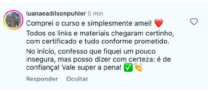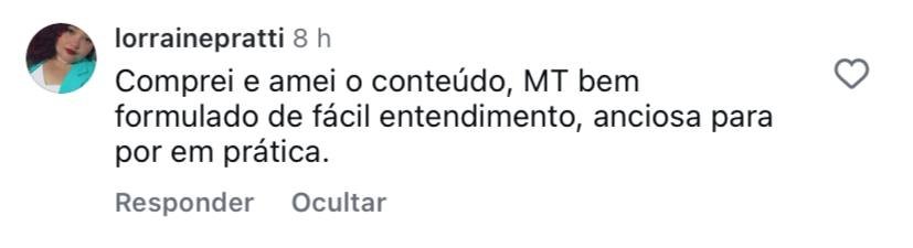 Você terá 7 dias para testar o curso, praticar e decidir se a metodologia faz sentido. Caso não queira continuar, basta solicitar o reembolso dentro do prazo e terá 100% do seu investimento de volta.