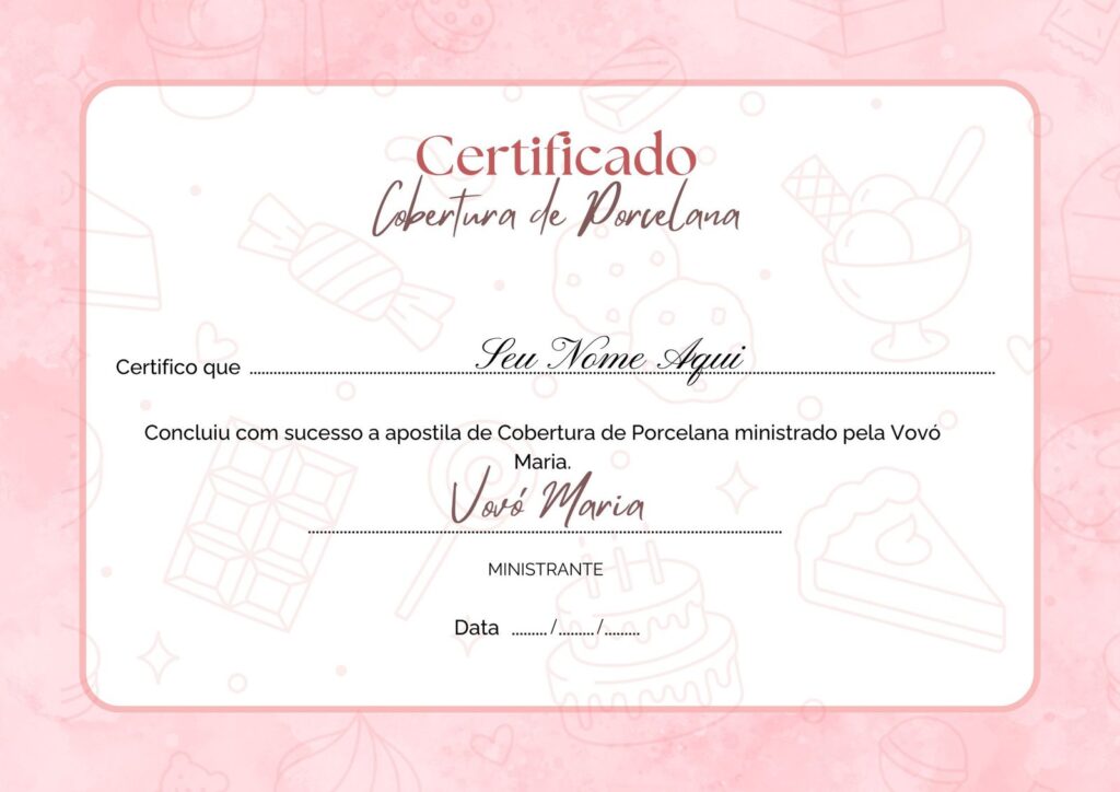 Ao concluir o curso, você receberá o seu certificado com a merecida aprovação de competência, pronto para ser impresso e exposto em sua confeitaria!