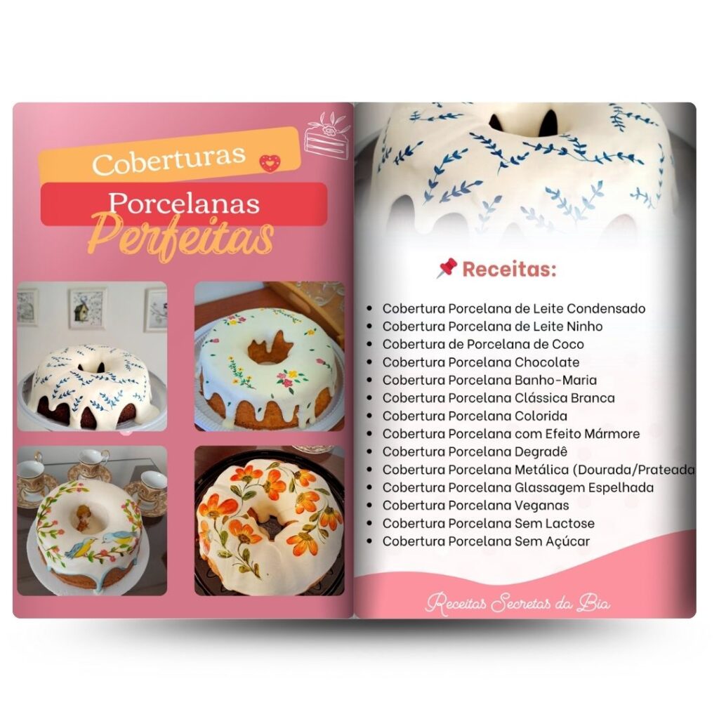 São mais de 30 receitas e técnicas de coberturas Porcelana, são receitas práticas e econômicas para você faturar muito durante o ano todo.